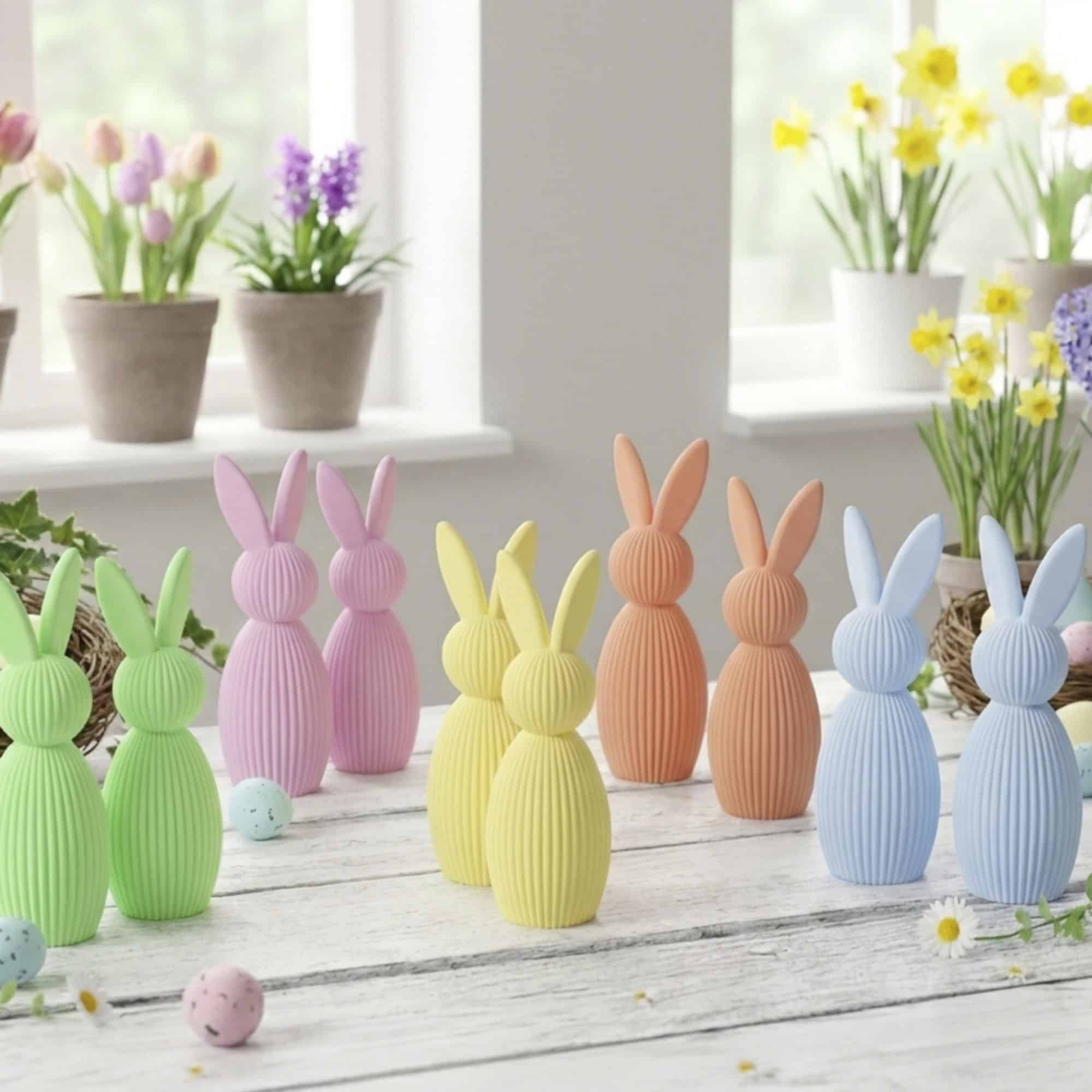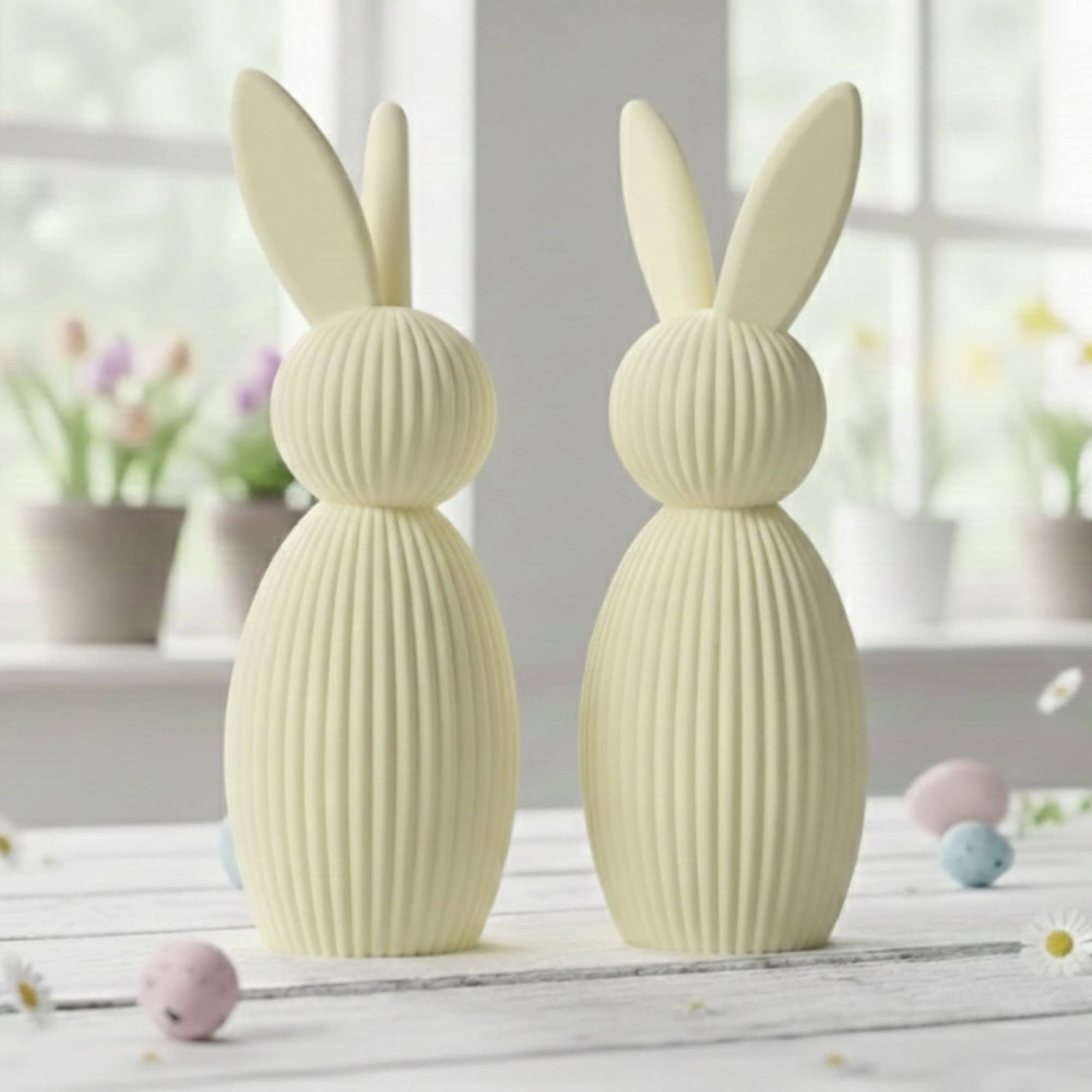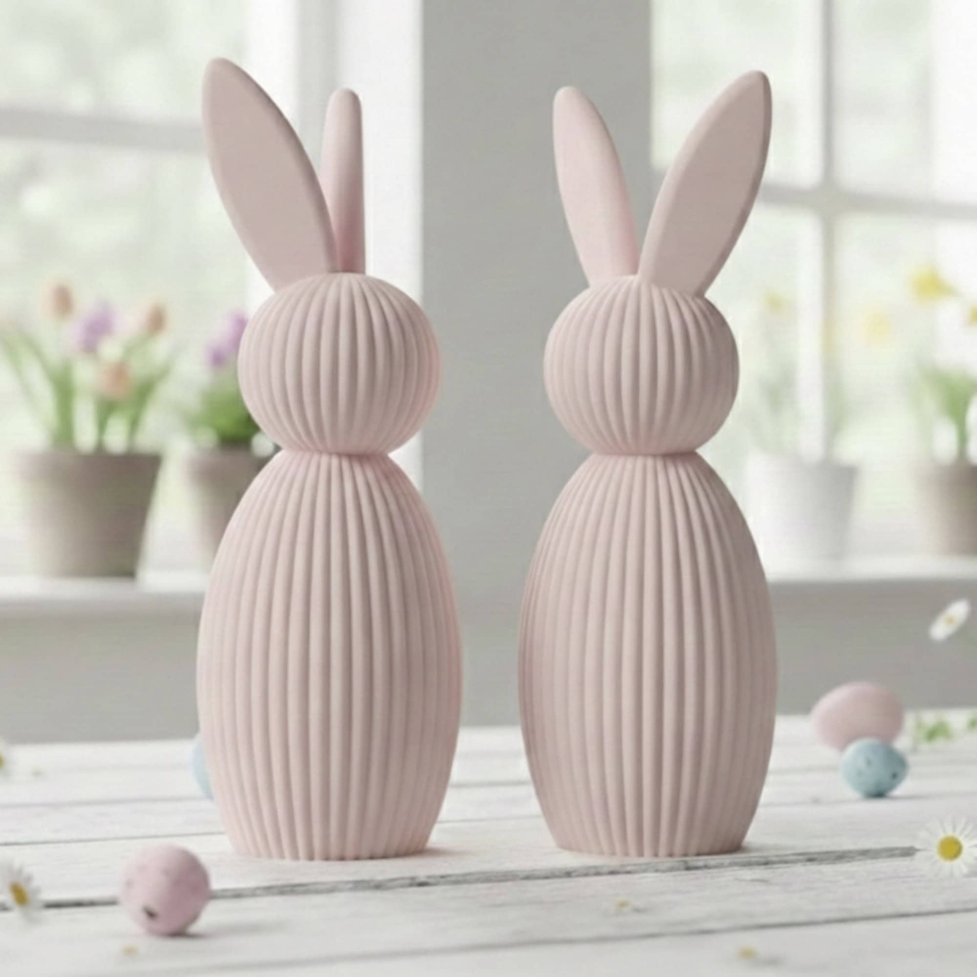 De Happy Ear Bunny is het vrolijke broertje van je Lazy Ear Bunny: twee rechtopstaande oortjes, een zachte ronde vorm en een fijne ribbeltextuur die mooi speelt met licht en schaduw. Het resultaat is een clean, modern decoratiebeeldje dat meteen een lentegevoel geeft — zonder té schreeuwerig te worden.