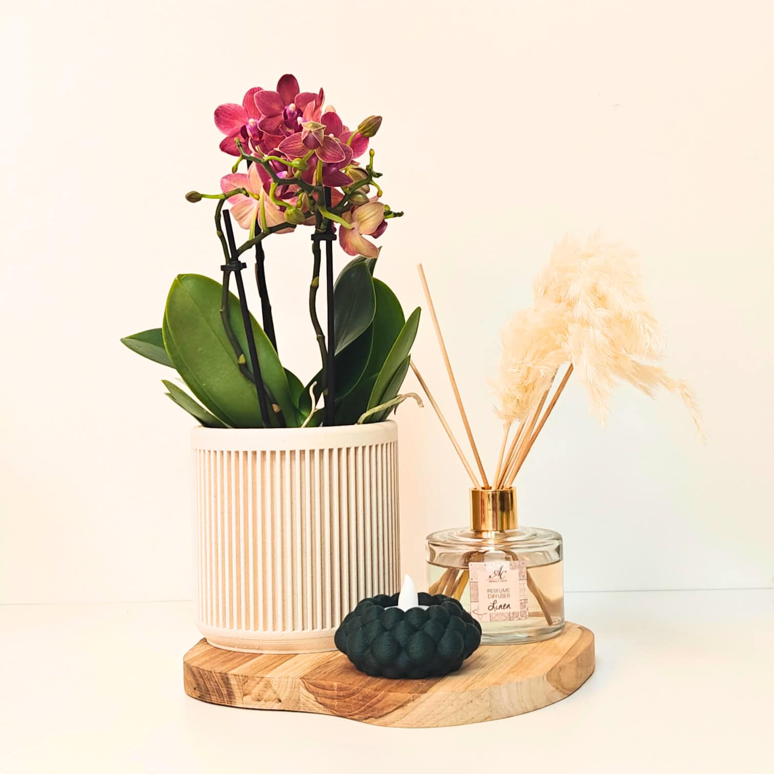 Een architecturale bloempot met verticaal reliëf en warme houttinten, geïnspireerd op mid-century design. Tijdloos, rustig en tactiel.
