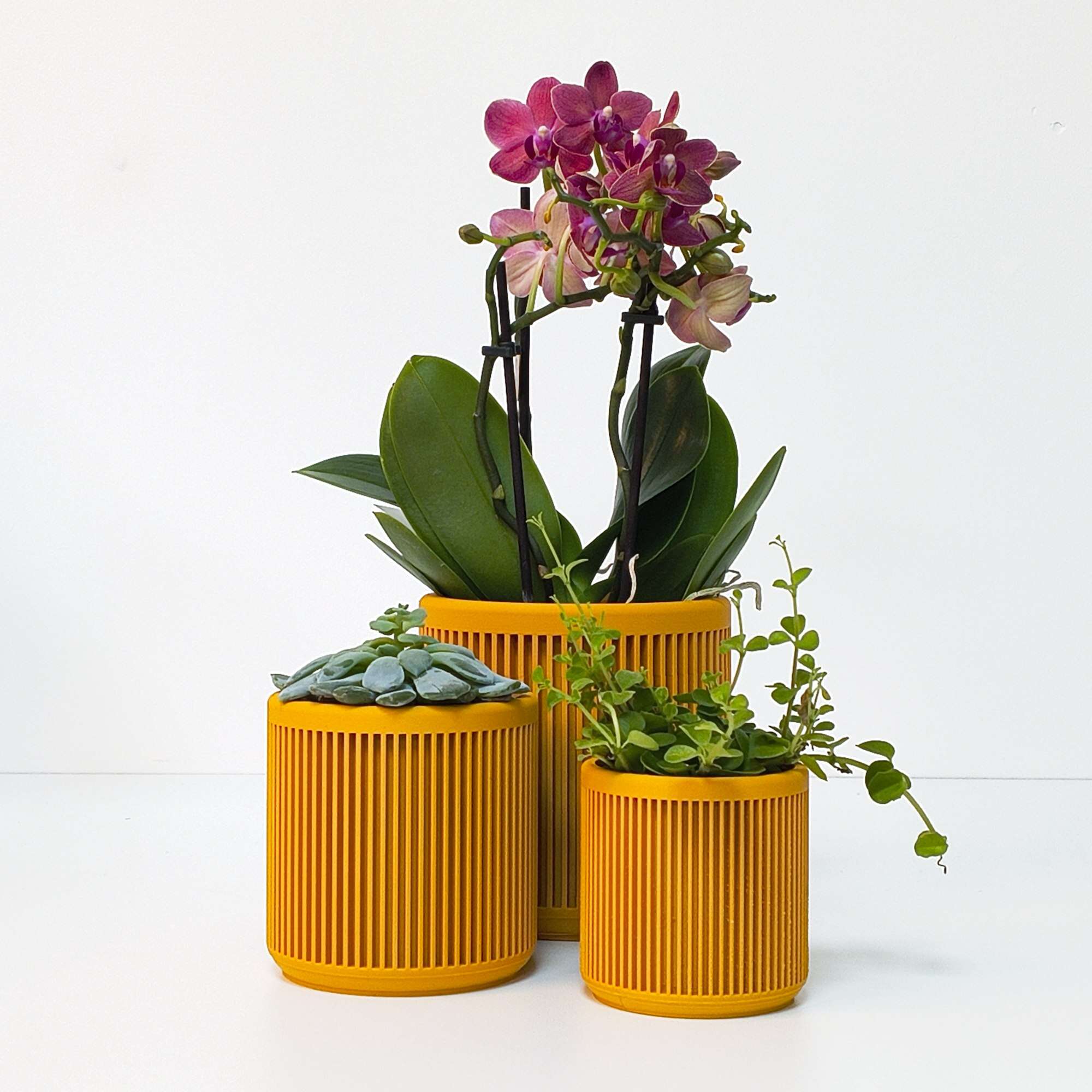 De vorm is bewust tijdloos gehouden: strak, evenwichtig en zonder overbodige details. Het reliëf vangt het licht subtiel en geeft diepte vanuit elke hoek, waardoor de planter zowel alleen als in set sterk tot zijn recht komt.
